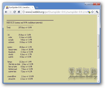 統計:本項目勝出者為Google Chromium 9.0.595.0,僅用了207.6ms的短暫時間便完成測試。