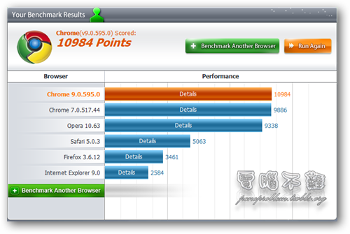 統計:本項目Google Chromium 9.0.595.0以高達10984的分數領先對手,而Google Chrome 7.0.517.44則是緊追在後。