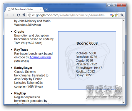統計:本項目Google Chromium 9.0.595.0以高達6068的分數領先對手,而Google Chrome 7.0.517.44則是緊追在後。
