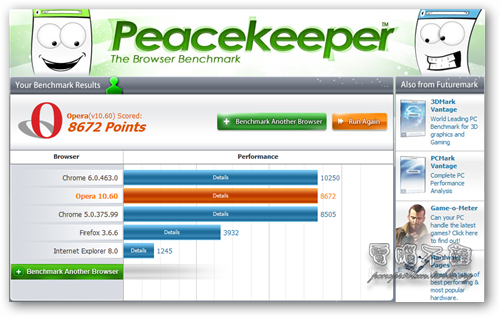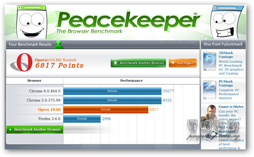 上次我已經有介紹過Peacekeeper這個網站了,這次就只純粹是放上我用Peacekeeper測試瀏覽器的結果,供各位參考到底該選擇哪款瀏覽器好。