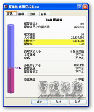 - WinRAR:21.7MB→7.77MB 壓縮率為35%