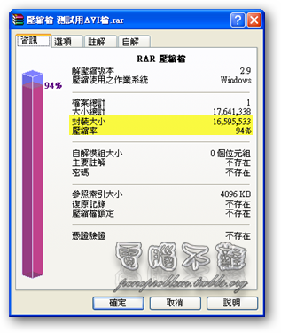 - WinRAR:16.8MB→15.83MB 壓縮率為94%