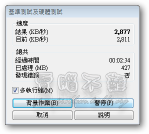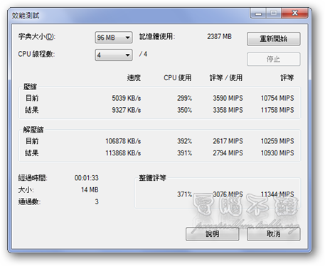 使用內建的測速功能,7-Zip的速度約為WinRAR的1.7倍。