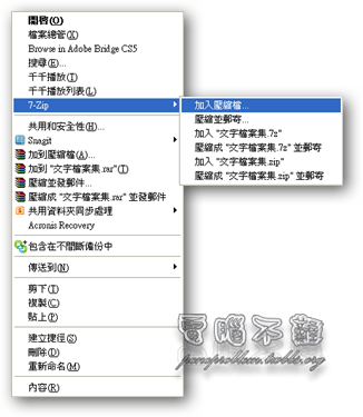 步驟一 在想要壓縮的檔案或資料夾上面按下滑鼠右鍵出現功能表單,選「7-Zip→加入壓縮檔..」。