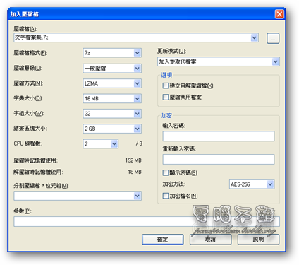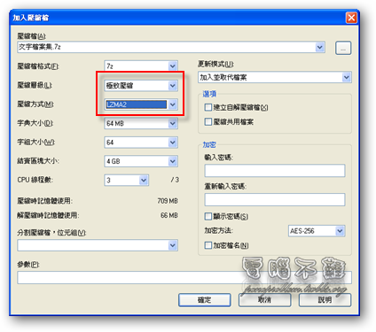 步驟二 接著設定壓縮方式。如果你想要讓壓縮出來的檔案大小最小,請將壓縮格式改為「7z」,壓縮層級改為「極致壓縮」,壓縮方式改為「LZMA2」,然後按下「確定」按鈕。