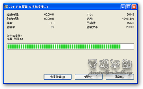 7-Zip的壓縮能力有沒有WinRAR好,實際壓縮出來就知道!在此就簡單壓縮幾個檔案來互相比較一下。以下的測試均使用雙方的最大壓縮方式。