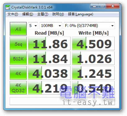 速度測試。讀取11.86MB/s,寫入 4.509MB/s,普普通通。