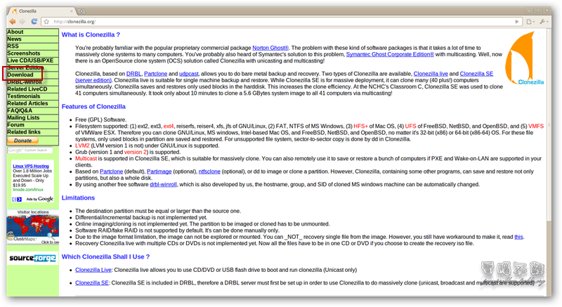 首先利用上面的連結進入Clonezilla的英文或是中文網站,我以英文網站為例,因為下載點比較好找。連進去後按下左邊邊欄的「Download」。