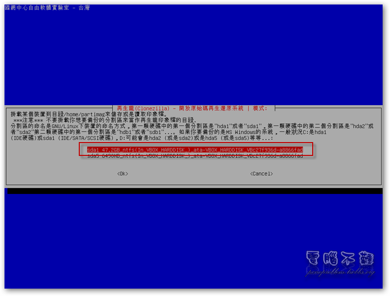 接著要掛載分割區,請選擇要放置映象檔案的分割區,切記勿掛載要進行備份的分割區,否則待會兒會無法備份。下圖中可見到兩個分割區,上面那個用紅框框起來的是WindowsXP所在的分割區,而下面那個是我專門用來放置映象備份檔案而切出來的分割區。作業系統放置的分割區不能選,因此選擇另外的分割區。