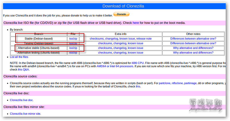 接著又會看到一堆莫名其妙的格式版本,什麼iso, zip ,i486 ,i686, amd64的。先來探討iso和zip,iso是光碟的映象檔案,若要將Clonezilla燒成光碟使用,就選用這個格式;zip是壓縮檔案,若要將Clonezilla放置在隨身硬碟或是隨身碟使用的話,就選用這個格式。而i486、i686, amd64是指你的CPU版本,以現在的電腦來說,多半是使用64位元的CPU,所以使用amd64版本;如果電腦是32位元的多核心CPU,使用i686版本;若為單核心CPU,請使用i486版本。