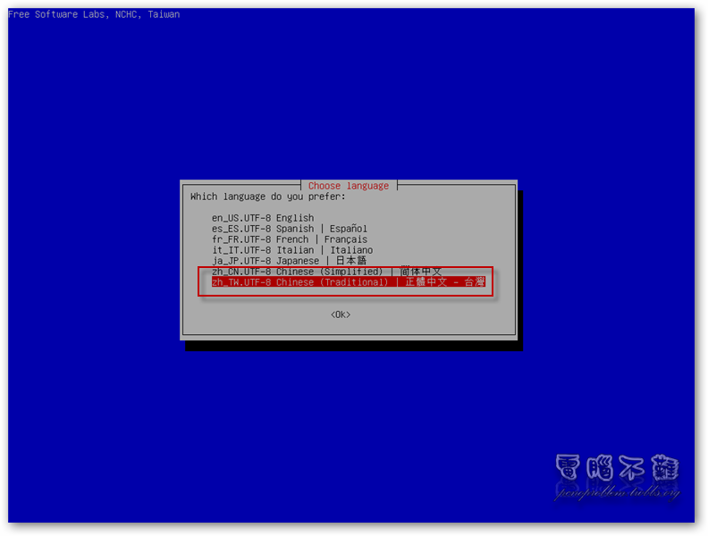 接著選擇語言,我以正體中文為例。Clonezilla Live都是文字版的介面,執行起來十分快速,節省系統資源!