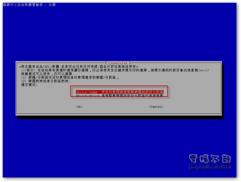 這裡選擇「device-image 使用映象檔處理整顆磁碟或部份分割區」。由於Clonezilla用途很多,我沒有辦法詳細一一做介紹,就挑出一個大家最常用到的「備份及還原作業系統磁碟分割區」來做說明。