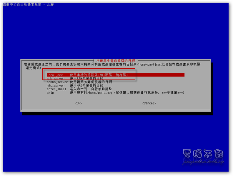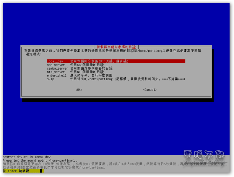 備份磁碟分割區之前,要先掛載該磁碟分割區之外的分割區來進行儲存映象檔的工作。這裡選擇「local_dev 使用本機的分割區(如硬碟, 隨身碟)」,之後你可以考慮要將映象檔放置在硬碟或是隨身碟中。我以硬碟為例。