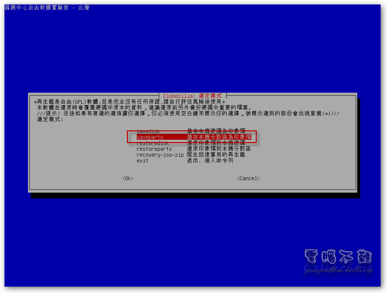 來到Clonezilla的功能選定模式,要備份作業系統的儲存分割區,就選擇「saveparts 儲存本機分割區為映像檔」。