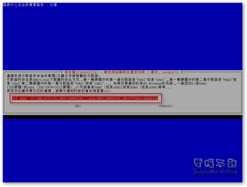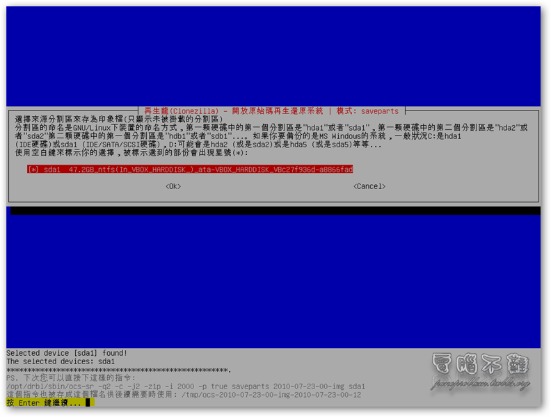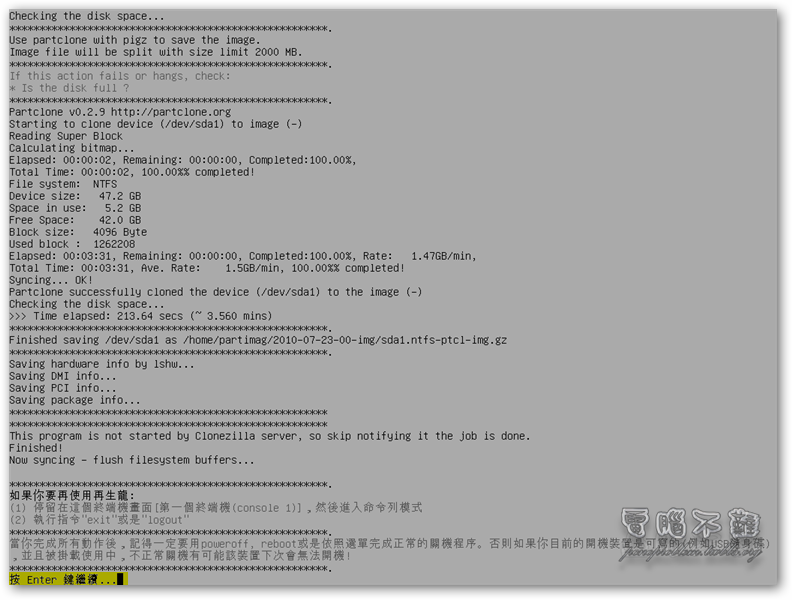 Clonezilla有個缺點,就是它很囉唆,步驟太多,不過速度快是毋庸置疑的。這裡還要按下Enter。