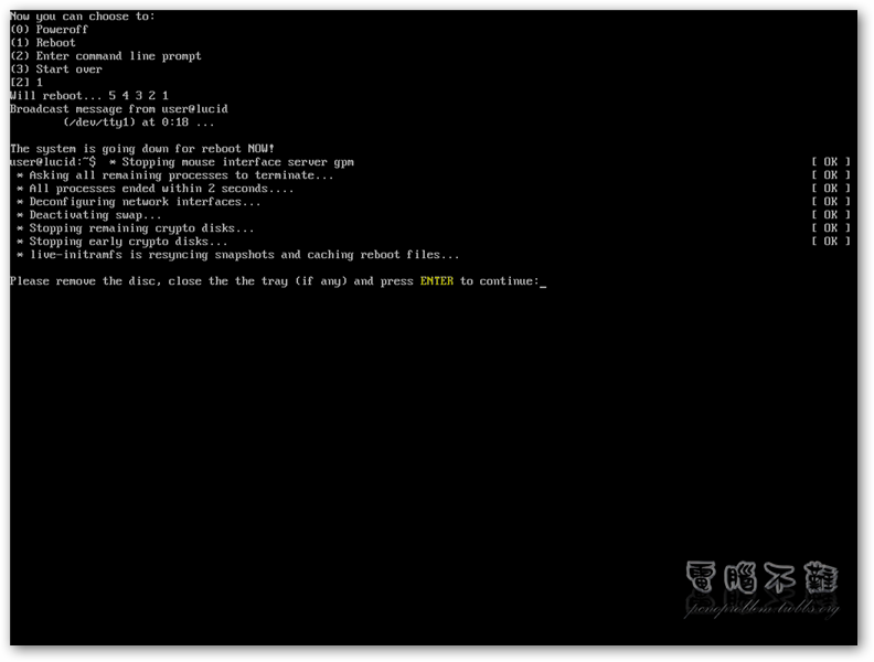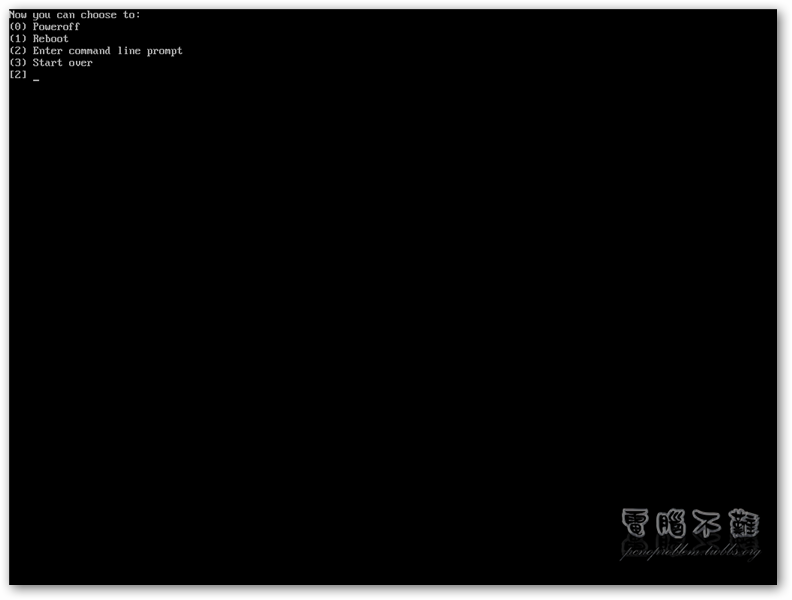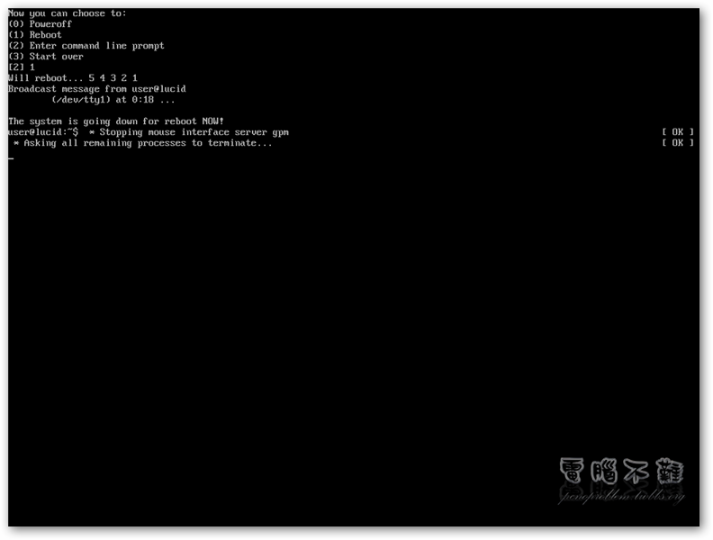 接著你可以輸入「0」關機、「1」重開機、「2」進入命令模式、「3」重新執行Clonezilla。既然備份完了,就重開機看看吧!輸入「1」,按下Enter。