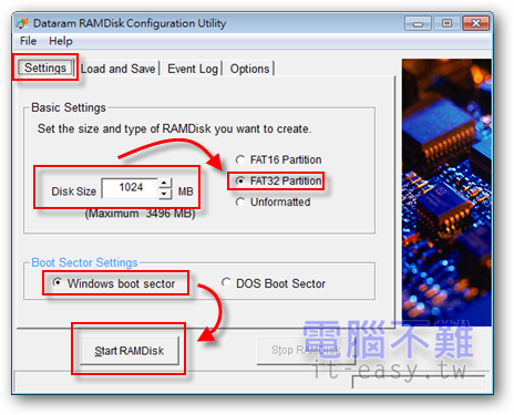 開啟Dataram RAMDisk Configuration Utlity,在「Settings」頁籤下設定RAMDisk的大小(如果只有拿來存放一般暫存檔案的話,1024MB就夠了),格式使用「FAT32」。Boot Sector選擇「Windows Boot Sector」。設定完成後按下「Start RAMDisk」。