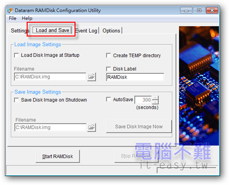 另外在「Load and Save」頁籤下,可以設定RAMDisk在關機時將檔案存到硬碟內,下次開機再移入RAMDisk中使用。當然這項功能會拖累電腦的開關機速度,沒有必要建議不要使用。