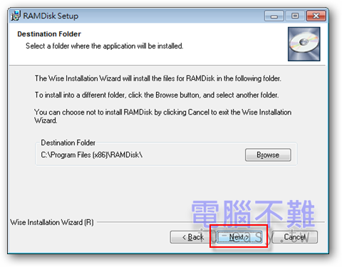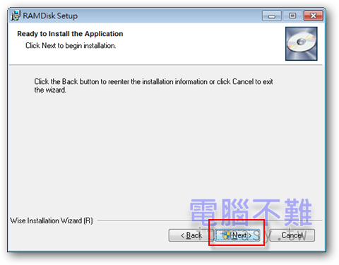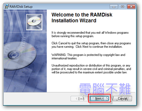 步驟一 將Dataram RAMDisk下載下來後,執行安裝檔。一開始會出現歡迎畫面,可以直接按下「Next >」繼續下一個步驟。