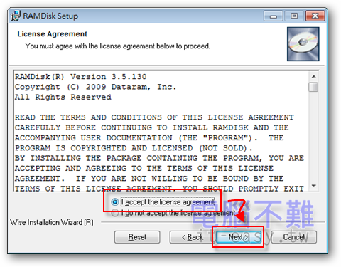 步驟二 選擇「I accept the license agreement」(我同意上面的許可協議),按下「Next >」繼續下一個步驟。