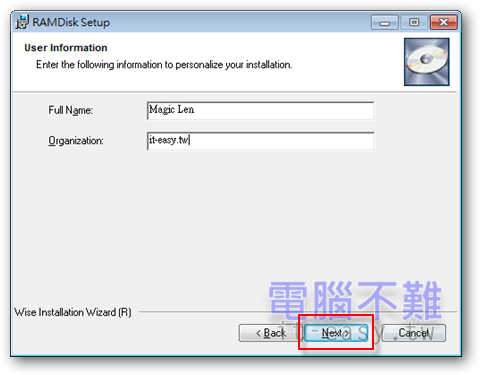 步驟三 輸入姓名和組織名稱,按下「Next >」繼續下一個步驟。