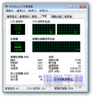 使用Dataram RAMDisk之前,可以先按下「Ctrl + Alt + Del」開啟工作管理員,查看目前系統的記憶體使用量,來決定RAMDisk的大小。Windows 7作業系統建議保留2G以上的記憶體,Windows XP作業系統建議保留1G以上的記憶體。才不會因模擬RAMDisk導致可用實體記憶體不足,反而降低電腦效能。