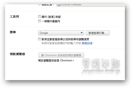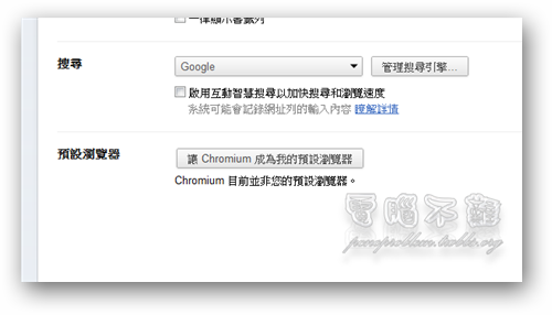 當然,可以直接利用瀏覽器自動跳出的設定預設瀏覽器提示來進行預設瀏覽器的設定。如果不幸沒有出現提示,各家瀏覽器也都有提供手動設定的方式。以Google瀏覽器為例,可在「選項→基本選項」中找到設定預設瀏覽器的地方。