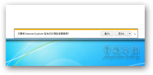 如下圖所示(IE9為例),就是當作業系統的預設瀏覽器被更改時,非預設的瀏覽器就會出現設定預設瀏覽器的提示。