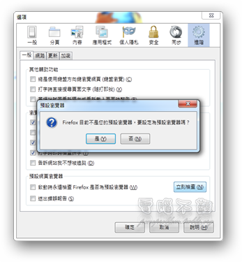 若想讓Firefox成為預設瀏覽器,可以在「選項」設定視窗中的「進階」標籤頁,找到預設瀏覽器的項目。