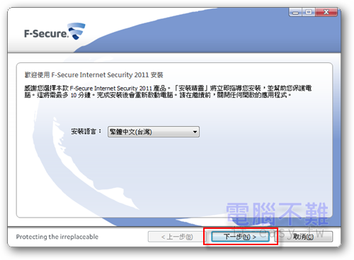 F-Secure Anti-Virus 2011總共有English、繁體中文(台灣)、繁體中文(香港),三種語言。安裝程式會自動偵測作業系統使用的語系,幫使用者選擇好最適當的語言。在此以繁體中文(台灣)為例。