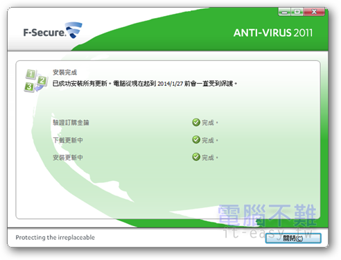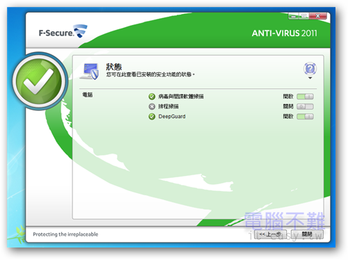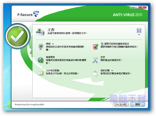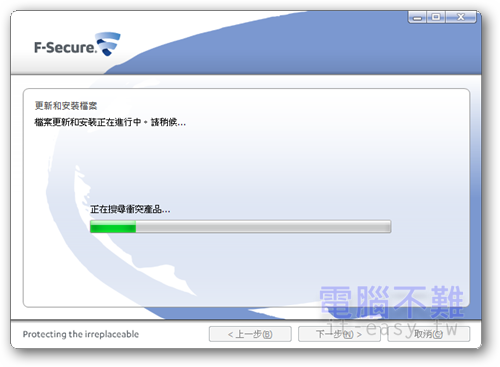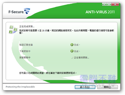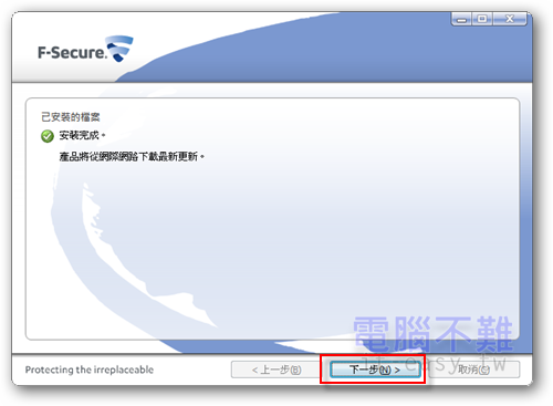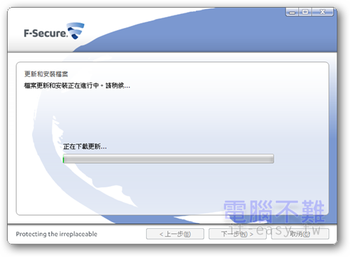 安裝完成後,按下「下一步」,便可以連上網路更新F-Secure Anti-Virus 2011。
