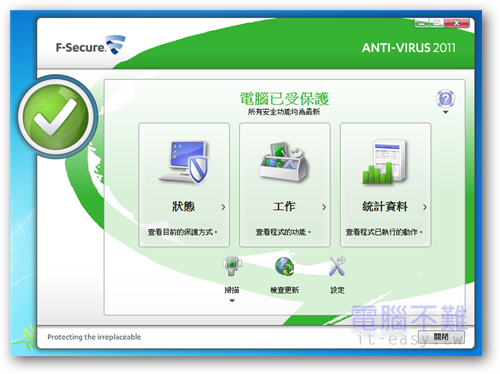 F-Secure Anti-Virus 2011的操作介面算是簡潔易懂,將所有功能分為狀態、工作、統計資料,這三大類。