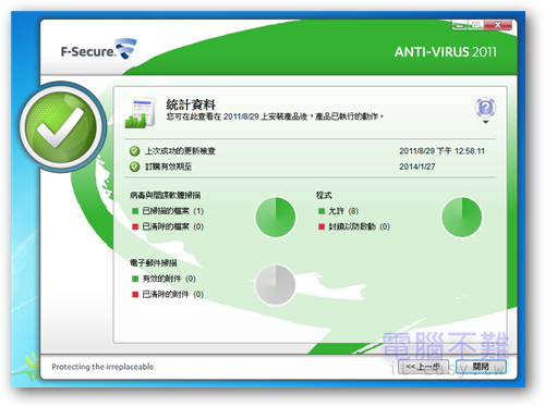 使用者可在統計資料分區中查看從安裝F-Secure Anti-Virus 2011到現在的數據累計紀錄,和最近更新的日期時間還有產品訂購的有效期限。