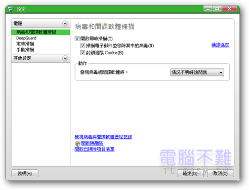 F-Secure Anti-Virus 2011的各項功能都可以在「設定」視窗中進行更詳細的調整。