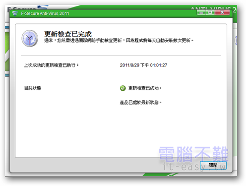 雖然F-Secure Anti-Virus 2011有自動更新功能,但如果想立即進行更新,也還是可以直接按下F-Secure Anti-Virus 2011操作介面的「檢查更新」。F-Secure Anti-Virus 2011會開出專門的更新視窗出來,顯示檢查更新的資訊。