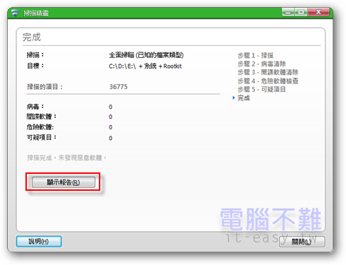 前面提到F-Secure Anti-Virus 2011內建多種掃描引擎,如果想要查看這些掃描引擎的詳細狀況,可以在掃描精靈結束掃描後,按下「顯示報告」按鈕。