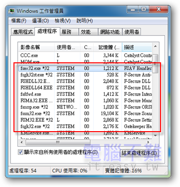 根據工作管理員的顯示,F-Secure Anti-Virus 2011在剛開機的情況下一共佔用系統大約31MB的記憶體,算是非常省資源的防毒軟體!