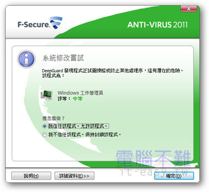 若有程式要對系統進行不正常的修改,F-Secure Anti-Virus 2011會自動跳出詢問視窗,讓使用者決定是否要進行修改動作。