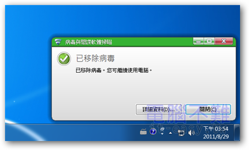 F-Secure Anti-Virus 2011的即時掃描,若發現病毒在預設情況下,會自動進行會適當的動作,並在螢幕右下角出現提示訊息。