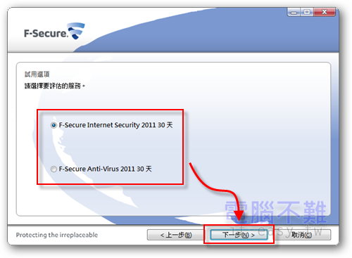 (此安裝檔已包含F-Secure Anti-Virus 2011和F-Secure Internet Security 2011,會依安裝時輸入的序號來決定要安裝哪種。若安裝時未輸入序號,可以使用30天試用版本)
