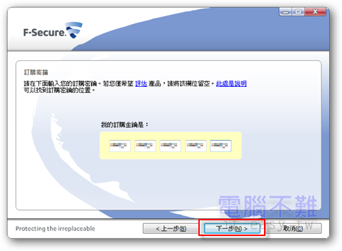 接著安裝程式會要求使用者輸入產品的訂購金鑰(就是序號),輸入完成後按下「下一步」。