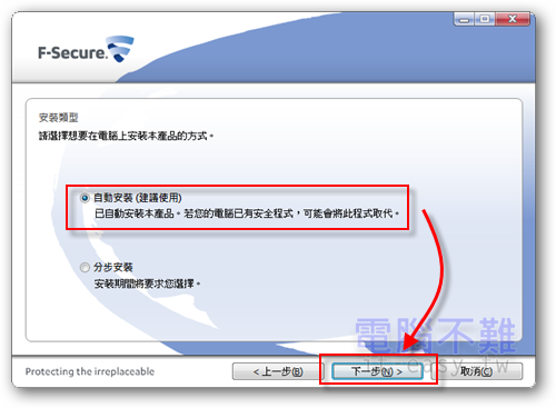 安裝類型的部分。選擇「自動安裝」,按下「下一步」,就可以開始安裝了!