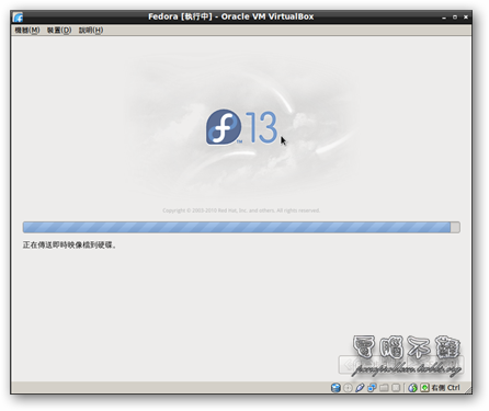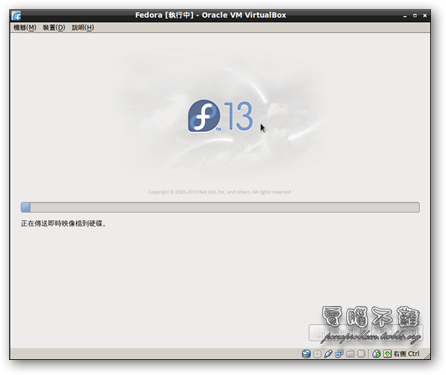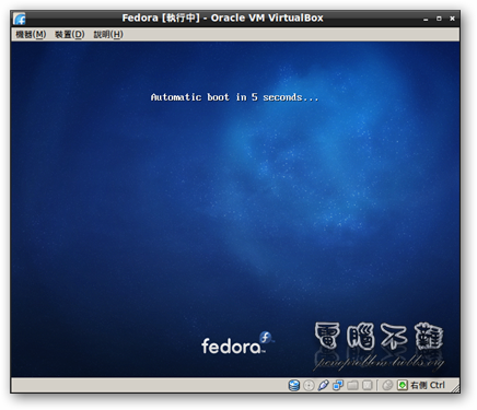 步驟二 放入Fedora Live CD,重新開機,等待光碟讀取,會看到一個倒數計時的畫面,此時按下鍵盤上隨便一個鍵。