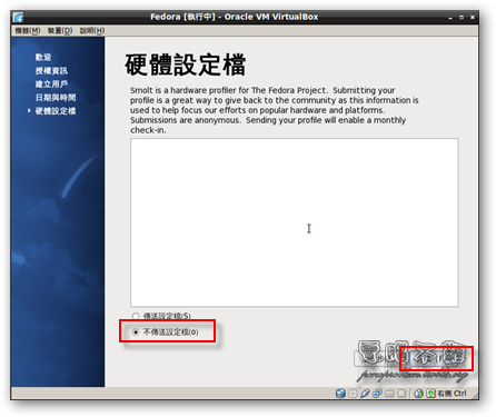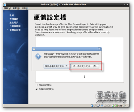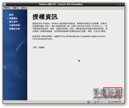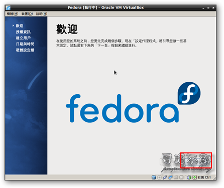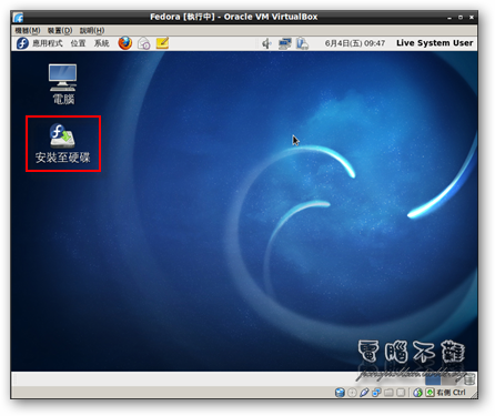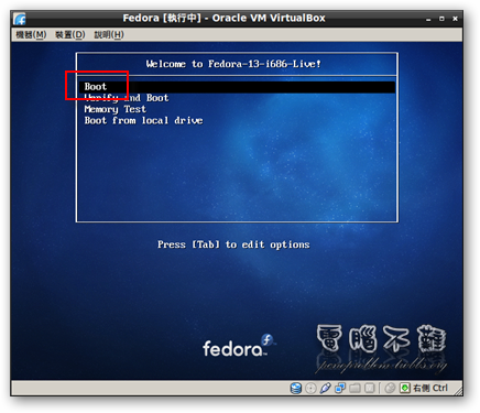 步驟一 燒好Fedora Live CD後,我們要用CD來進行開機的動作。若您不會使用BIOS設定光碟開機,請參考這篇。