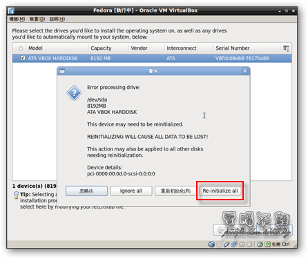 步驟十三 如果是還沒有分割過的硬碟,則會出現如下的視窗,此時選擇「Re-initialize all」。
