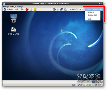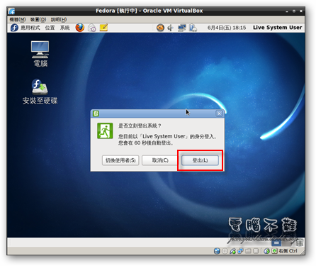步驟二一 回到Fedora Live CD桌面,點選最右上角的Live System User,按下「結束」,點「登出」。