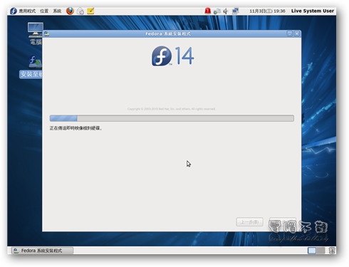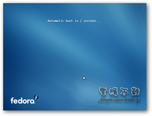 步驟二 放入Fedora Live CD,重新開機,等待光碟讀取,會看到一個倒數計時的畫面,此時按下鍵盤上隨便一個鍵。