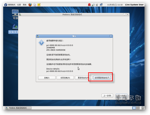 步驟十二 如果是還沒有分割過的硬碟,則會出現如下的視窗,此時按下「全部重新初始化」。