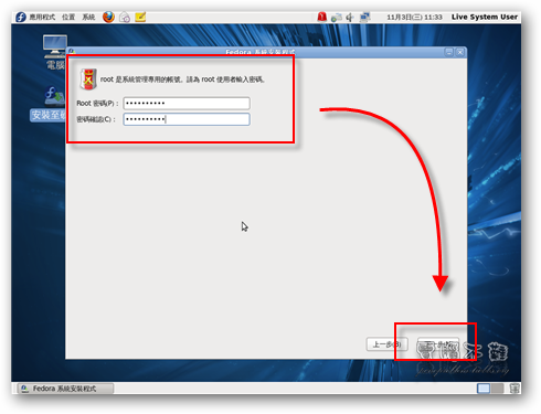 步驟十五 設定root(最高管理權限)密碼,按「下一步」。