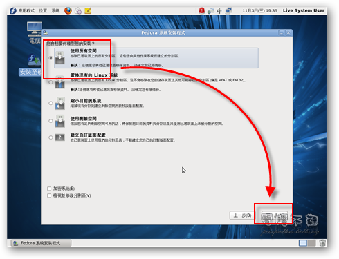 步驟十六 若電腦裡只想灌Fedora,選擇「使用所有空間」,按「下一步」。